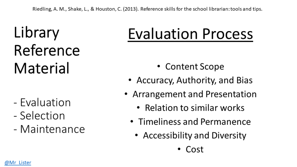 This section of the course discussed the skills, processes, and strategies required to effectively select, evaluate and manage a reference collection. I enjoyed this section the most because it afforded me the opportunity to assess my school library’s reference section and make some concrete plans for the future. As a new teacher-librarian, my introduction to the role has been a series of steep learning curves, so up until recently, I had not had the chance to take an objective look at every reference item in both print and digital form. After I did find the time, I determined which print reference items to replace and discovered many under-utilized items in our digital reference collection. In order to evaluate my library’s collection, I used Riedling’s framework as a guide.