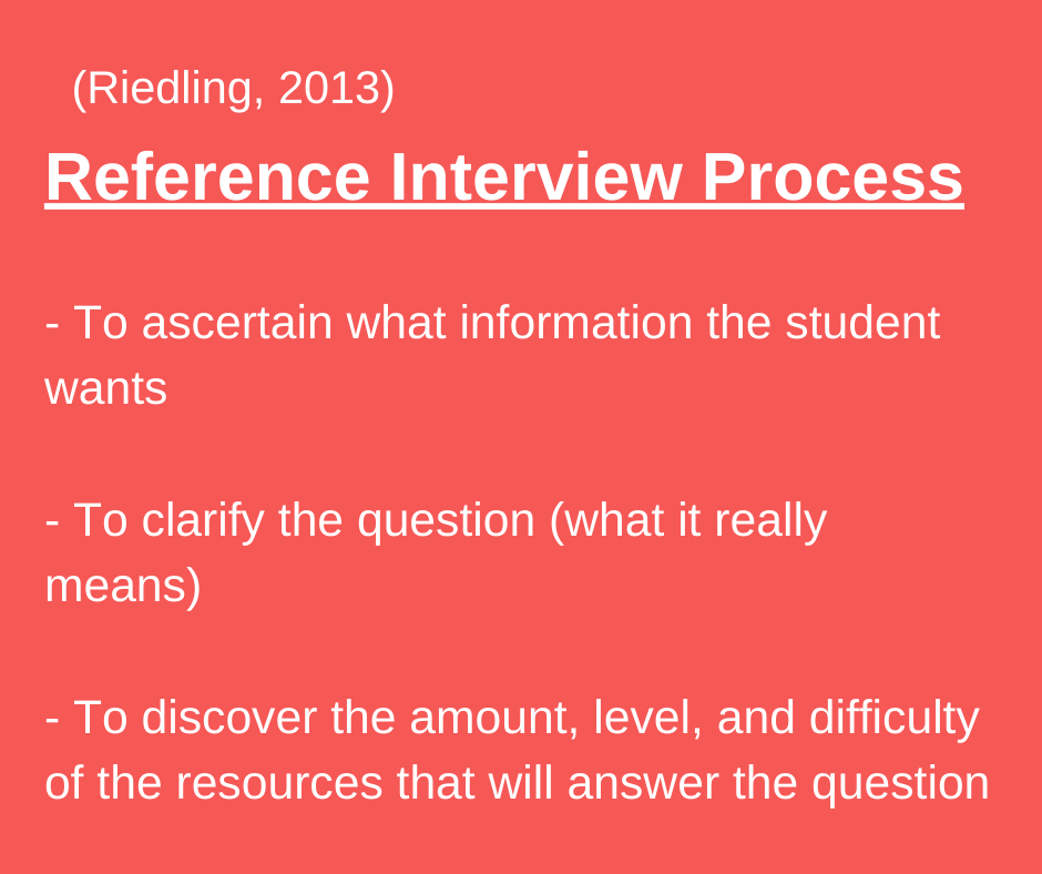 If one of the primary goals of the teacher-librarian is to assist students in the use of the library and its collections, then I look forward to refining the way I interact with students using the Reference Interview process. I understand that the process is really a conversation that identifies and supports students’ research needs. I feel the more I experience I have, the quicker and more effective my answers and suggestions will be.