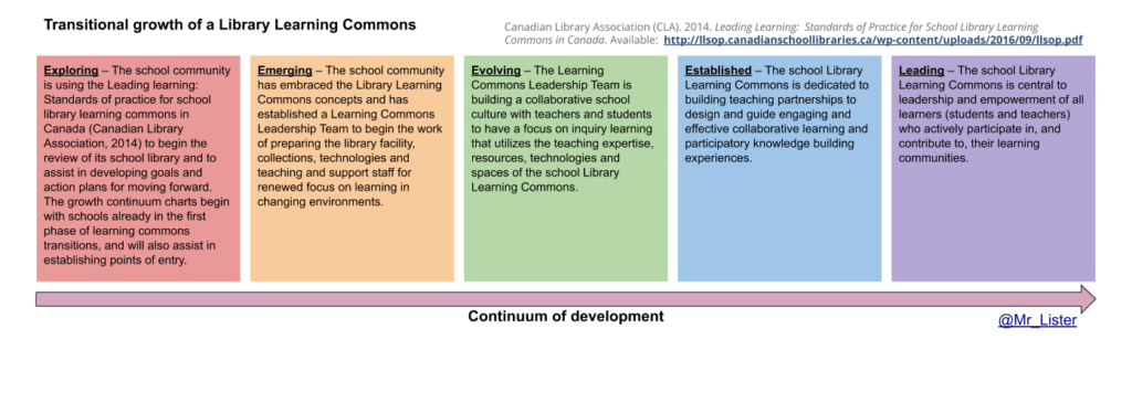 “Reference Selection and Evaluation” by Christopher Lister is licensed under CC BY-NC-SA 4.0 The Standards of Practice for School Library Learning Commons in Canada document 2014 also proved helpful in determining where my current practice lies and where I would like it to go. I believe my school library is in the Exploring phase. There are several members of staff, myself included, and administration who feel like we should be in the Emerging phase, but for now are making progress in the right direction.