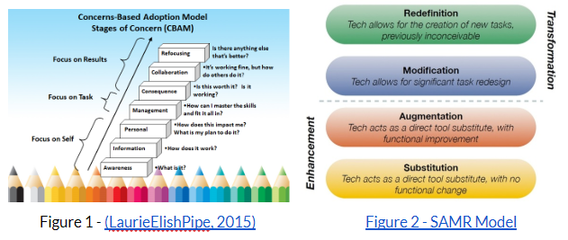 our own way of thinking.” – George CourosFor the purpose of this assignment, I will discuss two fictitious teachers who work in the same elementary school and their effective use of reference resources in their pedagogical practices. Using the Concerns-based Adoption Model (Figure 1) to evaluate the success of new programs and techniques, as well as SAMR model ( Figure 2) of technology integration, I will compare the two teachers in their approach to change.