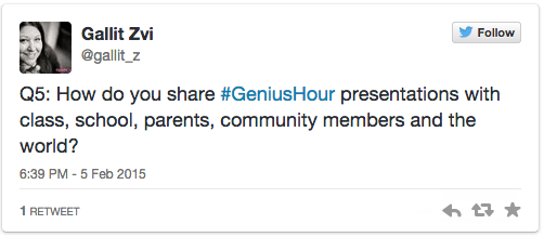 After a round of brief introductions, chat moderator for the night, @Gallit_z, offered the above questions for the group to discuss. During my initial attempt at introducing inquiry learning with my students last year, I was extremely vague on deadlines and due dates, and I believe this contributed to organizational challenges I experienced.  I was particularly interested in this question because my students didn’t get to present last year, and I wanted to get a sense of how this important part of the inquiry cycle would work in my setting.  Most of the educators who attended Thursday’s chat used some form of social media to allow their students to share their learning outside of the four walls of the classroom.  Social media networks allow students to engage in ‘visible thinking’ throughout their inquiry as oppose to just at the end of it.