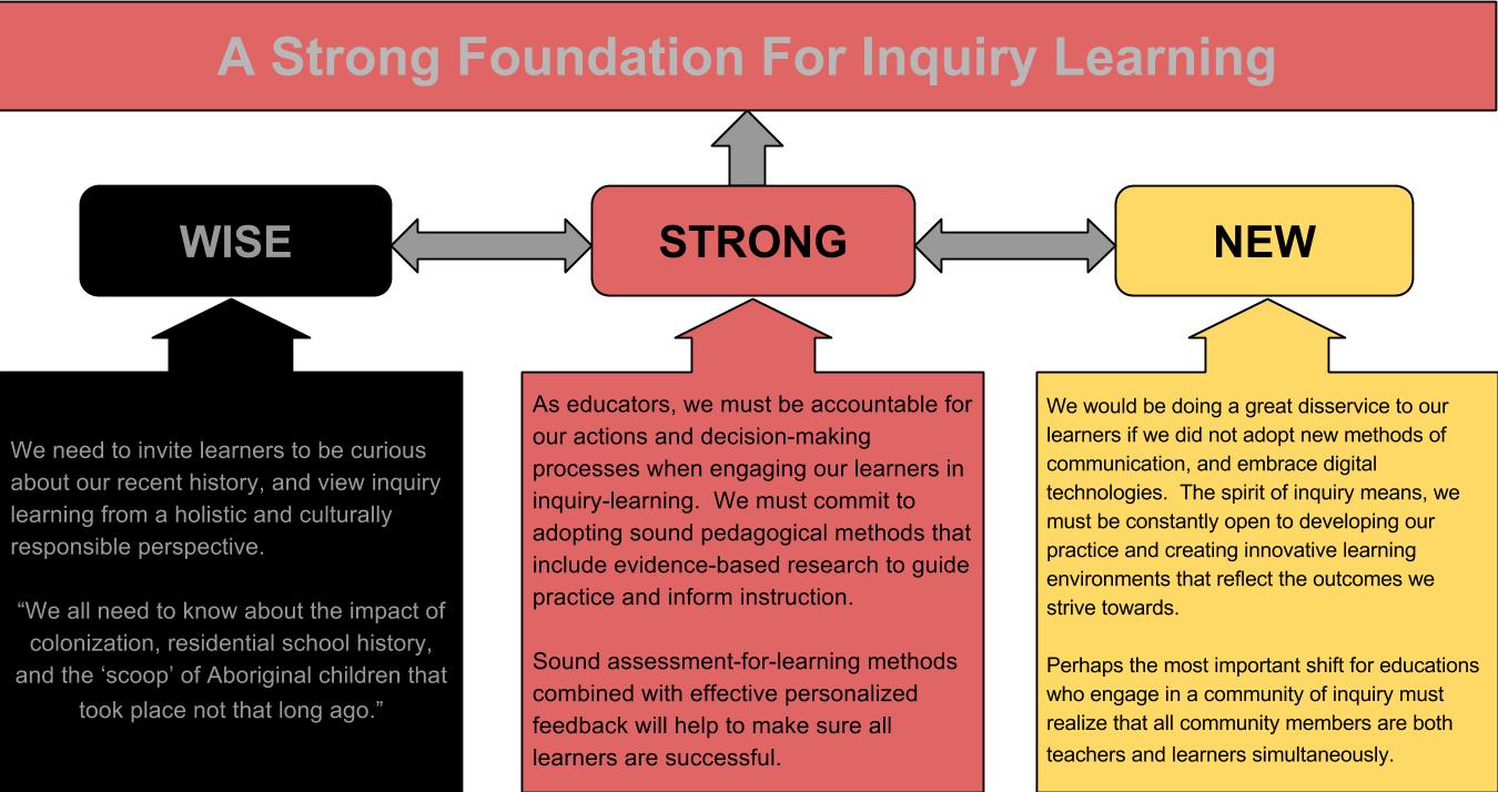 Inquiry-based learning is an approach to teaching and learning that places students’ questions, ideas and observations at the centre of the learning experience.  The underlying approach is the idea that both educators and students share responsibility for learning. I like Neil Stephenson’s Introduction to Inquiry-Based Learning and his view that inquiry involves: