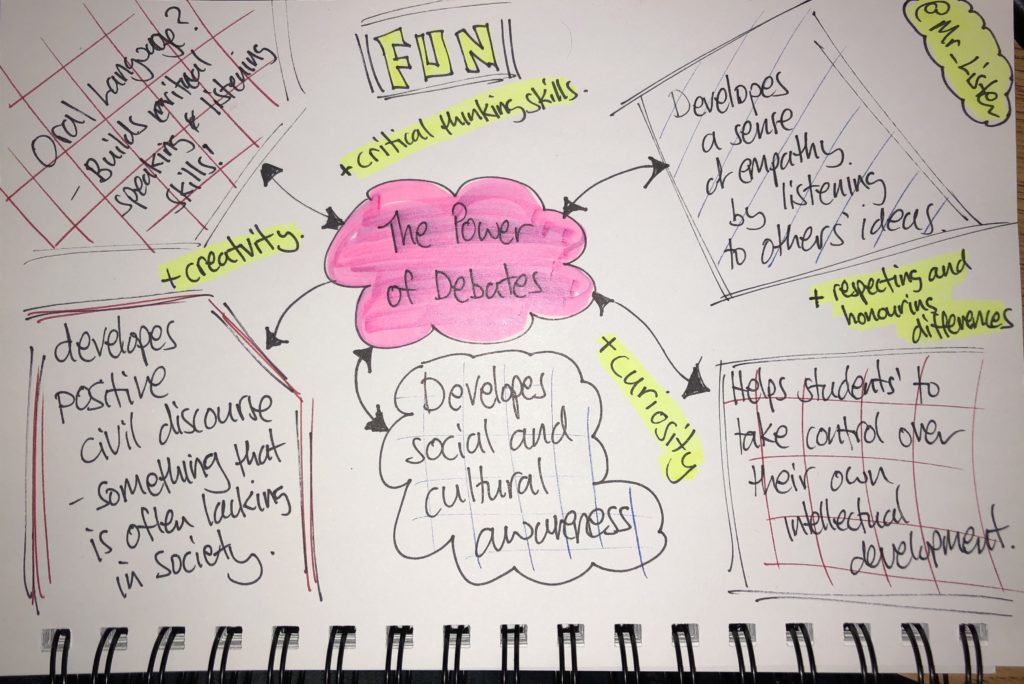 Holding small casual debates in class helps to develop powerful listening and speaking skills.  They also develop empathy, understanding, and introduce students to a variety of worldviews. Perhaps the most powerful part of class debates has been the way in which students have developed the ability to maintain different ideas/opinions without feeling judged or personally attacked.