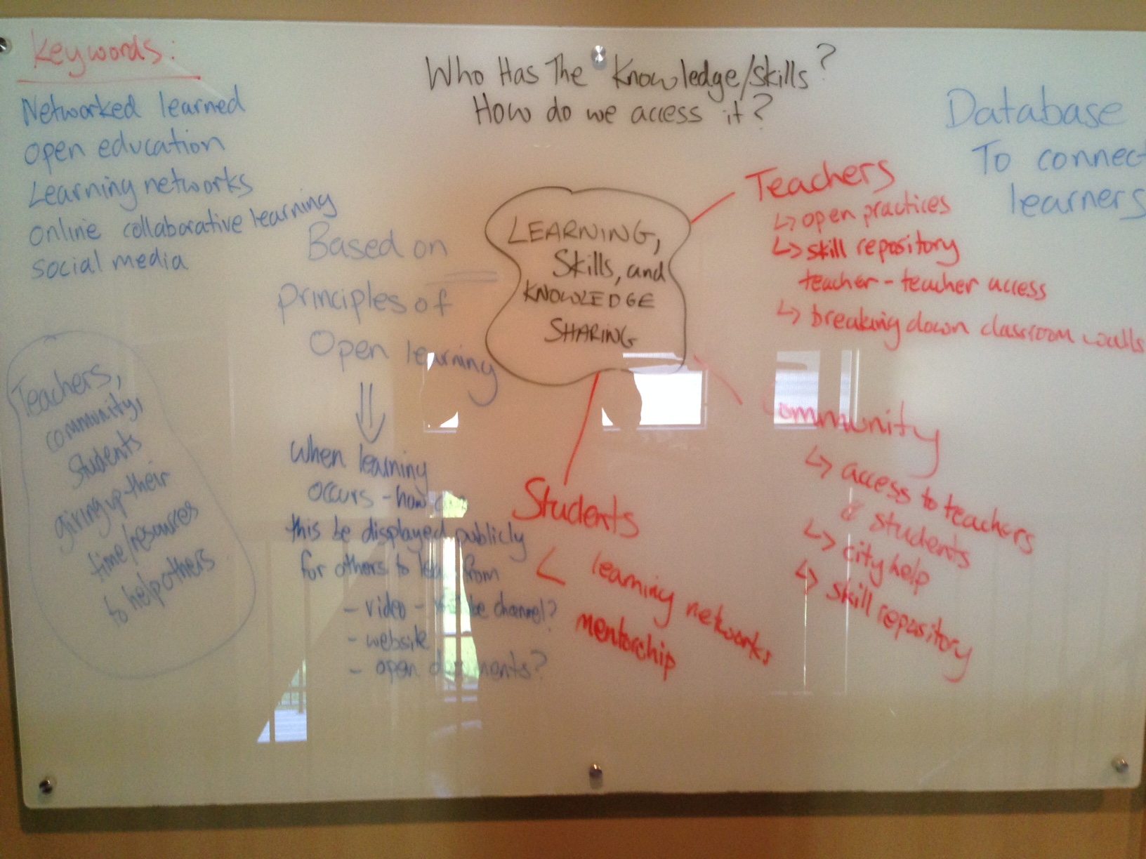 One idea I am currently exploring for my final project focuses on the sharing of knowledge. I often end up asking myself the question, who has the knowledge? And how do I access it?  An idea I am pursuing involves developing a skill/knowledge repository or database that would connect teachers, students, parents, and their community together.  For example, let’s say I am a teacher who is looking to develop their numeracy practice.  Who has the knowledge/skills in their school, district, or community, and how do we connect those people together.  If I have a classroom teacher and one of my students expresses an interest in animal biology, who can I connect them with, in the community, so they can continue their passion for learning about the subject.  It boils down to my belief that it takes more than a classroom teacher to educator a child.  I believe that there are people within and outside of the education system with valuable skills and knowledge who would be more than willing to share their knowledge and time, free of charge, if they knew what they had to offer was sort after.  A skill repository database would allow teachers to mentor each other and work on their craft.  For example, if I am a teacher looking to rework my science lessons based on new brain research or changing Ministry of Education curriculum guidelines, but science is not my speciality I could use the database to find a local teacher to mentor me.  In contrast, those offering to share their knowledge and have their skills included in the database would have the freedom to advertise how they would like to mentor.  I imagine some people would be more than happy to open up their classroom and invite teachers/students in to see work in practice while others might be more conformable meeting at a coffee shop to share resources.  Flexibility and convenience are the keys to developing such an idea.